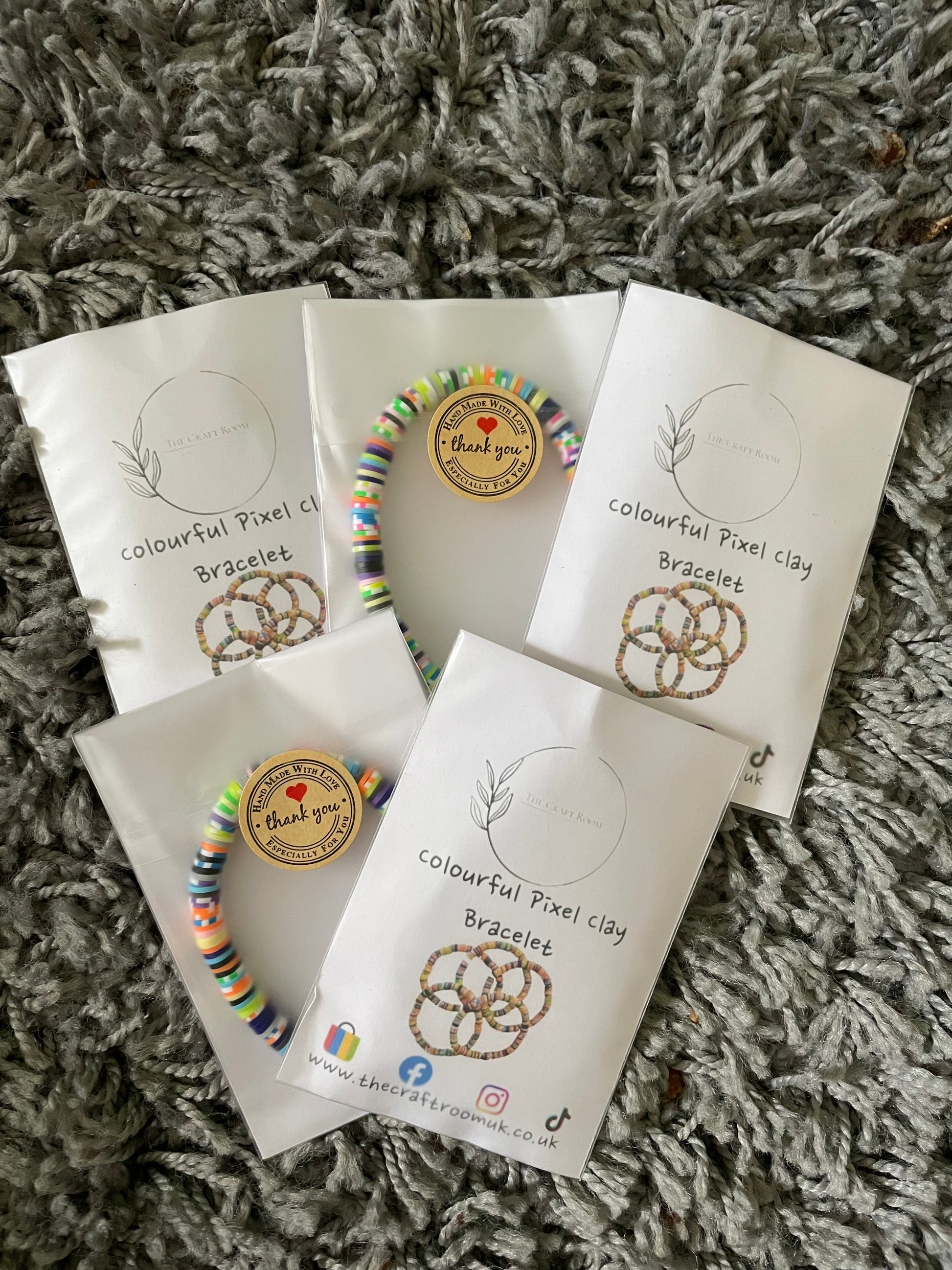 Introducing our Colourful Pixel Clay Bracelet, handcrafted with care using vibrant, pixelated polymer clay. Each bracelet is one-of-a-kind, adding a unique touch to any outfit. Experience the perfect combination of creativity and style with this stunning accessory.