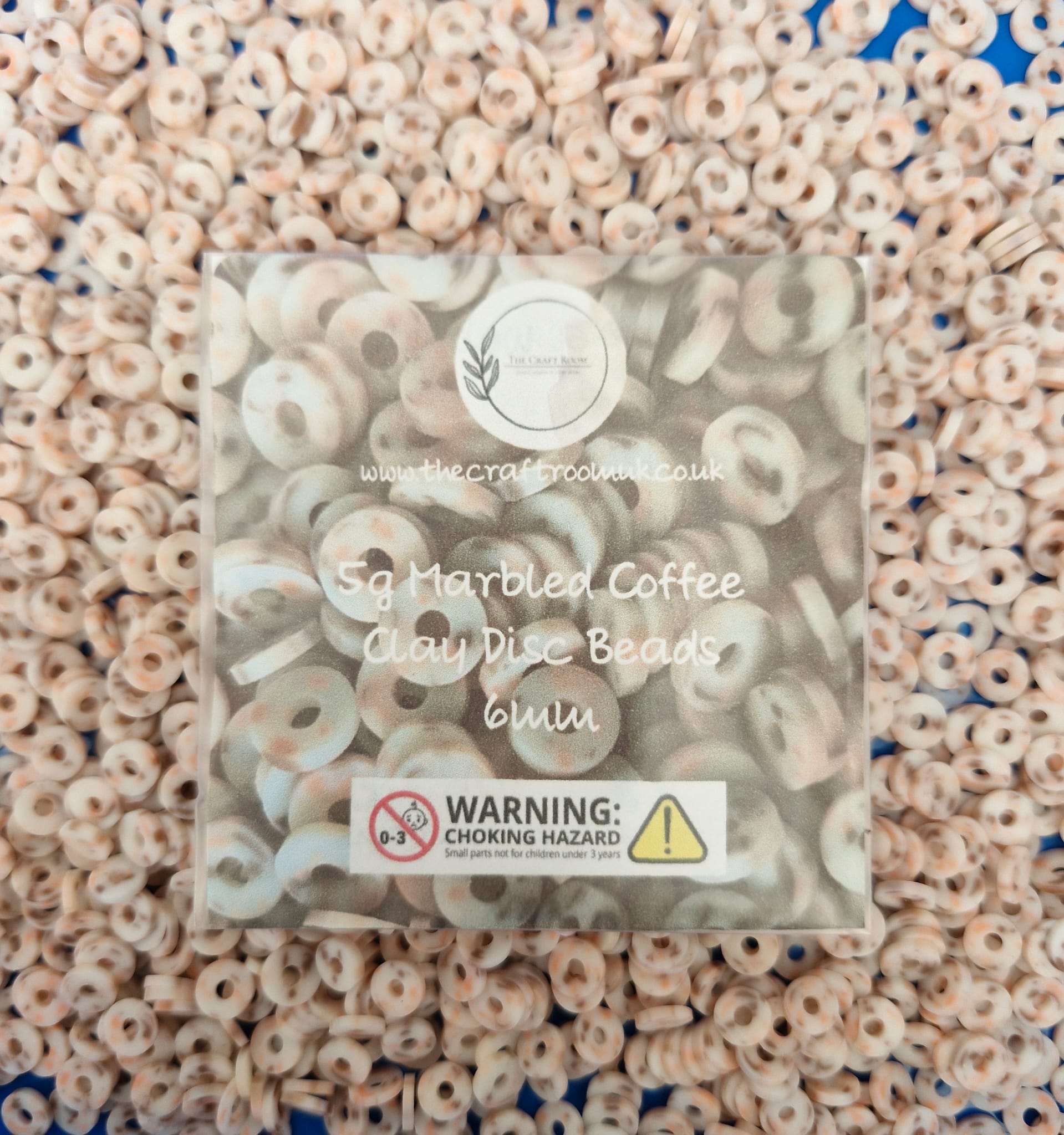 Enhance your jewellery collection with our Marbled Coffee Clay Disc Beads. The unique marbled effect of these 6mm coffee coloured beads adds depth and sophistication to any design. Bring your creations to life with these one-of-a-kind clay beads.